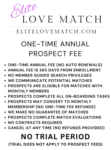 Unlock the ultimate dating experience with the Elite Love Match Annual Subscription. Our premium service features a guided search algorithm and manual reviews to help you find your perfect match. Start your journey with our special offer: enjoy a 7-day money-back guarantee trial at an introductory rate of just $468 for 12 months of service.